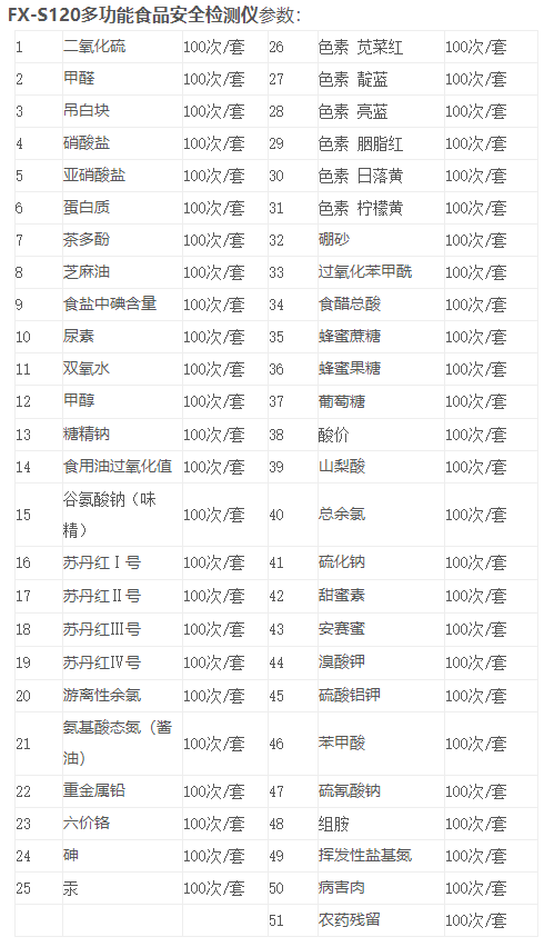 1、檢測項(xiàng)目:農(nóng)藥殘留、食用油酸價(jià)、過氧化值、甲醛、二氧化硫、吊白塊、亞硝酸鹽、面粉中鋁、蛋白質(zhì)、工業(yè)堿、雙氧水、硼砂、羅丹明B、過氧化苯甲酰. 糖精鈉。蘇丹紅(Ⅰ號(hào)、Ⅱ號(hào)、Ⅲ號(hào)、Ⅳ號(hào))等擴(kuò)充檢測項(xiàng)目50多種。
