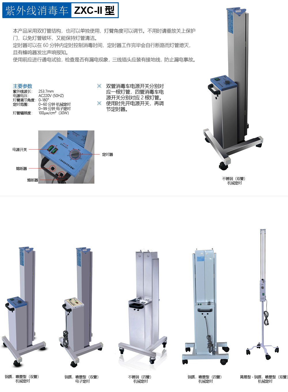 產(chǎn)品采用雙燈管結(jié)構(gòu),也可以單獨(dú)使用,燈臂角度可以調(diào)節(jié)。不用時請垂放關(guān)上保護(hù)門,以免燈管破壞,又能保持燈管清潔。