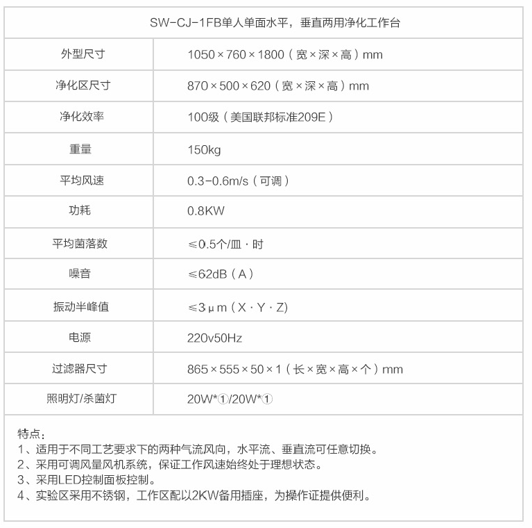 > 蘇州智凈單人單面水平、垂直兩用凈化工作臺 SW-CJ-1FB